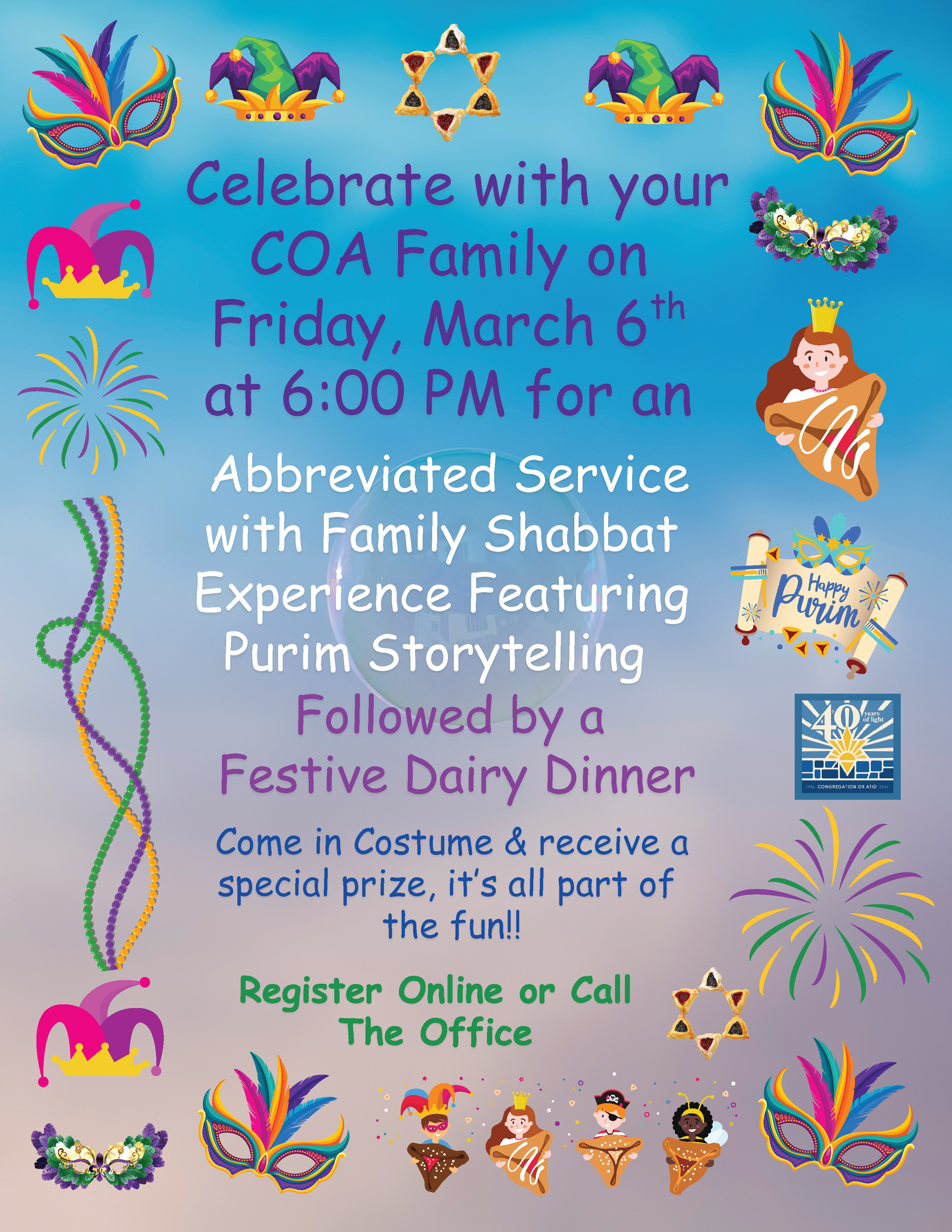 Come celebrate an abbreviated service with a family Shabbat experience featuring Purim storytelling and costume contest followed by a Festive Dairy Dinner.