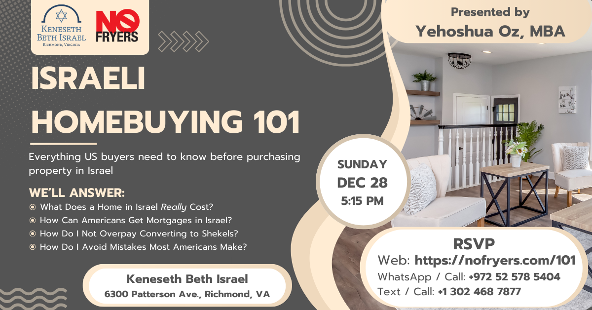 Presented by Yehoshua Oz, an Israel-based mortgage broker and financial coach who helps buyers navigate the Israeli homebuying process