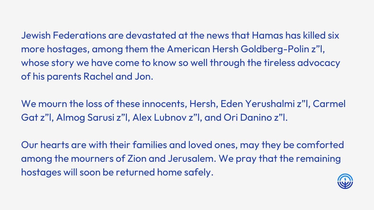 Jewish Federations are devastated at the news that Hamas has killed six more hostages, among them the American Hersh Goldberg-Polin z”l, whose story we have come to know so well through the tireless advocacy of his parents Rachel and Jon. We mourn the loss of these innocents, Hersh, Eden Yerushalmi z”l, Carmel Gat z”l, Almog Sarusi z”l, Alex Lubnov z”l, and Ori Danino z”l. Our hearts are with their families and loved ones, may they be comforted among the mourners of Zion and Jerusalem. We pray that the remaining hostages will soon be returned home safely.