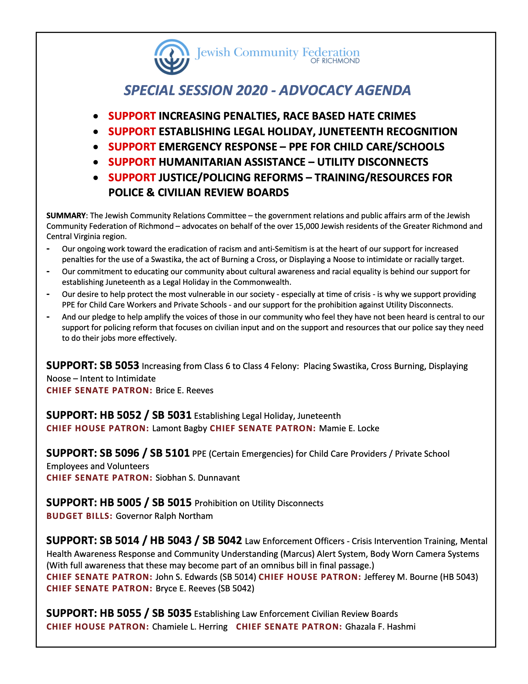 JCFR 2020 Special Session Legislative Agenda