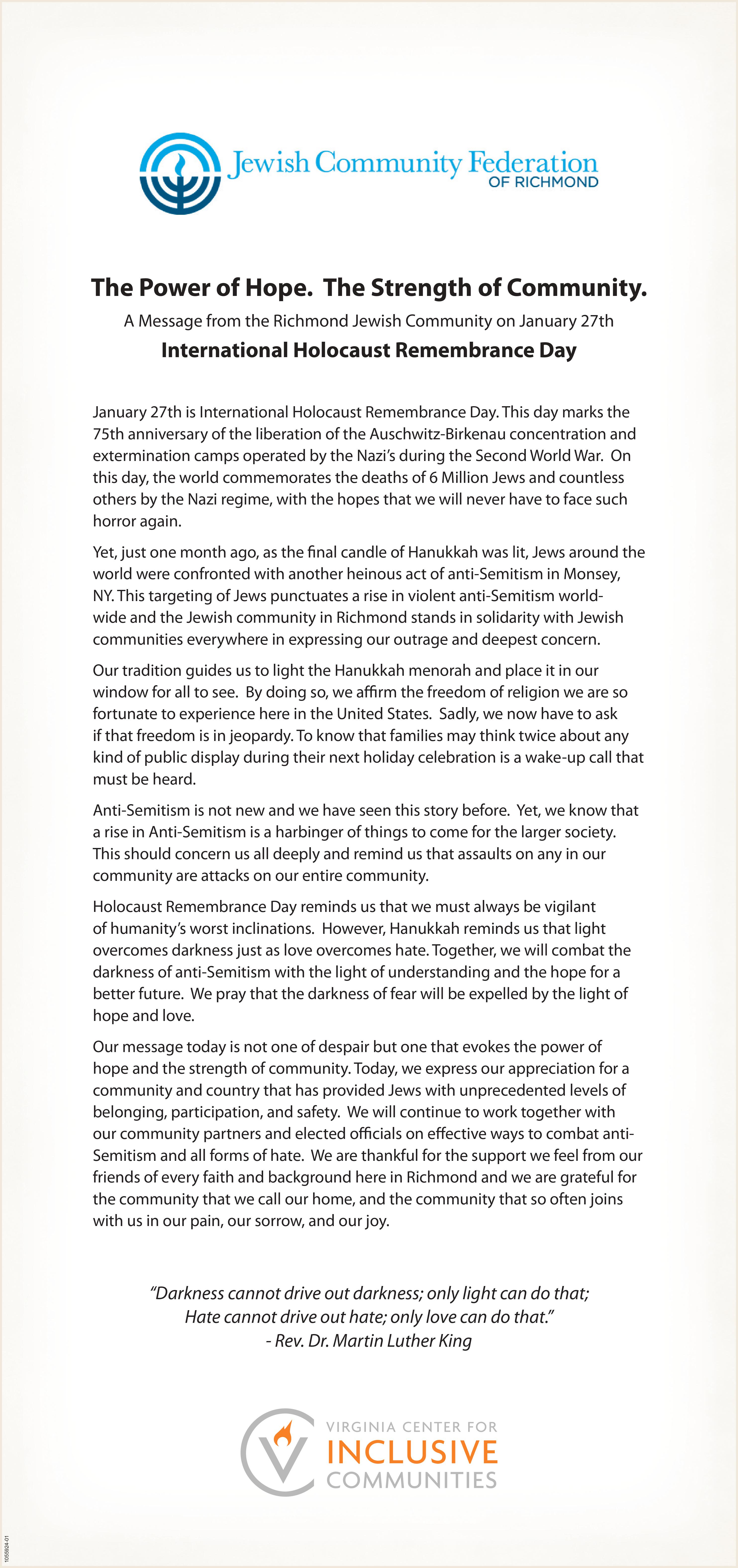 Today, as we join communities around the globe in remembering the horrors of the Holocaust, we also recall the strength and resilience of our people. We honor the memory of those lost, and the strength of the 80,000 survivors living in the United States, by redoubling our commitment to create a brighter future and care for those in need.